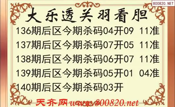 首页〉 大乐透杀号 走势图 大乐透预测大乐透杀号大乐透胆码大乐透技巧天齐图库走势图工具试机号 关羽25年140期大乐透后区杀号图谜 专题:后区杀号 发布时间:2025-12-07 00:24 走势图:大乐透综合走势图大乐透期尾走势图 推荐:宝彩APP 免费方案 智能荐号 热点导航 公告: 天齐新版APP<中大多>上线,点击领鲜 最新文章 大乐透2025140期[花枝绯色]前区公式杀号2025年大乐透第140期[大魔王]前区红球杀号2025年大乐透第140期[赴远山]前区精准杀号一码25140期[故事成书]超级大乐透前区杀号预测大乐透25140期[山水几程远]前区精准杀号大乐透第25140期[醉红尘]前区杀号 更多大乐透杀号 > 福彩3D 双色球 大乐透 排列三 更多> 3D胆码 3D预测 3D字谜 3D图谜 解太湖 3D条件 3D杀码 P3预测 P3图谜 P3字谜 P3条件 P3胆码 P3杀码 热点导航 天齐图库 走势图 工具图表 试机号 宝彩专家 智能荐号 菜单导航 关闭 福彩3D 3D专家 3D胆码 3D预测 3D字谜 3D图谜 解太湖 3D条件 3D杀码 3D技巧 3D走势图 体彩P3/P5 P3专家 P3预测 P3图谜 P3字谜 P3条件 P3胆码 P3杀码 P5预测 P3走势图 双色球 双色球专家 双色球预测 双色球杀号 双色球字图 双色球胆码 双色球走势 双色球技巧 大乐透 大乐透专家 大乐透预测 大乐透杀号 大乐透胆码 大乐透技巧 大乐透走势 天齐图库 七星彩 七星彩专家 七星彩预测 七星彩图谜 七星彩杀号 七星彩技巧 七星彩走势 天齐走势 七乐彩 七乐彩专家 七乐彩预测 七乐彩杀号 七乐彩技巧 七乐彩走势 热点导航 彩宝网 宝彩网 宝彩网 开奖公告 宝彩专家 牛票票