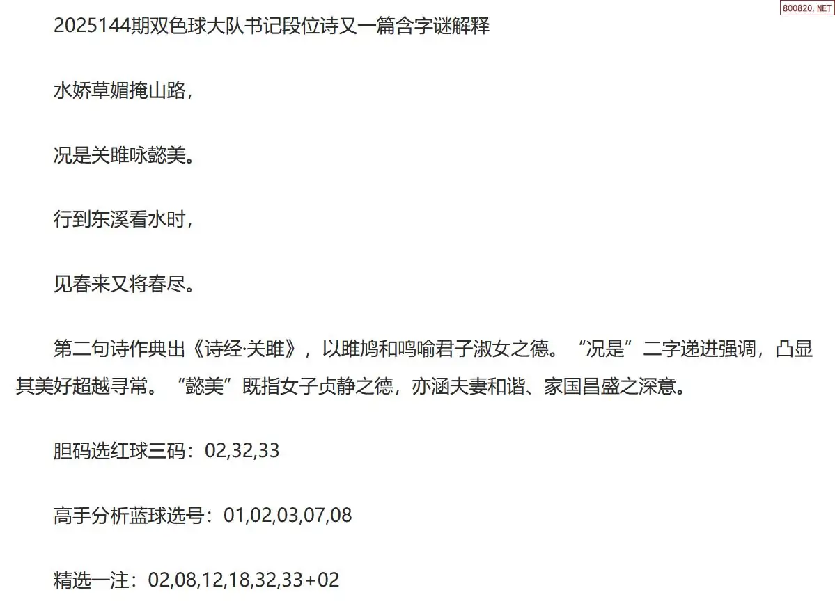 首页〉 双色球字图 走势图 双色球预测双色球杀号双色球技巧双色球字图双色球条件双色球胆码天齐图库走势图工具试机号 双色球第25144期大队书记最新段位诗谜又一篇 专题:大队书记 发布时间:2025-12-11 20:54 工具:双色球胆拖组号双色球缩水过滤 推荐:宝彩APP 免费方案 智能荐号 热点导航 公告: 天齐新版APP<中大多>上线,点击领鲜 最新文章 藏机图2025144期天齐原创双色球藏机图迷2025144期天齐网今晚双色球字谜总汇双色球25144期图迷画迷汇总(天齐整理)双色球25年144期天吉龙头凤尾鸟语断蓝图25年144期大胜寨双色球中奖真言双色球25144期牛彩字谜诗迷汇总(天齐整理) 更多双色球字图 > 福彩3D 双色球 大乐透 排列三 更多> 3D胆码 3D预测 3D字谜 3D图谜 解太湖 3D条件 3D杀码 P3预测 P3图谜 P3字谜 P3条件 P3胆码 P3杀码 热点导航 天齐图库 走势图 工具图表 试机号 宝彩专家 智能荐号 菜单导航 关闭 福彩3D 3D专家 3D胆码 3D预测 3D字谜 3D图谜 解太湖 3D条件 3D杀码 3D技巧 3D走势图 体彩P3/P5 P3专家 P3预测 P3图谜 P3字谜 P3条件 P3胆码 P3杀码 P5预测 P3走势图 双色球 双色球专家 双色球预测 双色球杀号 双色球字图 双色球胆码 双色球走势 双色球技巧 大乐透 大乐透专家 大乐透预测 大乐透杀号 大乐透胆码 大乐透技巧 大乐透走势 天齐图库 七星彩 七星彩专家 七星彩预测 七星彩图谜 七星彩杀号 七星彩技巧 七星彩走势 天齐走势 七乐彩 七乐彩专家 七乐彩预测 七乐彩杀号 七乐彩技巧 七乐彩走势 热点导航 彩宝网 宝彩网 宝彩网 开奖公告 宝彩专家 牛票票