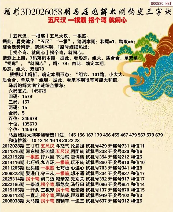首页〉 解太湖 走势图 3D胆码3D预测3D图谜3D字谜解太湖3D技巧3D条件3D杀码天齐图库走势图工具试机号 26年058期马后炮解太湖字谜之-五尺汉 一根筋 拐个弯 就闹心 专题:马后炮解太湖谜 发布时间:2026-03-08 20:30 开奖:3D开奖结果3D近10期试机号 推荐:宝彩APP 免费方案 智能荐号 热点导航 公告: 天齐新版APP<中大多>上线,点击领鲜 最新文章 中大多 3D第2026058徐文选3D独胆已连准 3D第2026058免费试料⑧中3 26年058期马后炮解太湖字谜之-五尺汉 一根筋 拐个弯 就闹心26058期3D丹东解太湖 天龙一语 布衣神算26年058期白鱼舟太湖钓叟三字诀解谜天涯草解太湖26年058期太湖 拐个弯福彩3D2026年057期[白虎]解太湖谚语 烫酒喝福彩3D2026年057期[青龙]解太湖字谜之烙饼吃 更多解太湖 > 福彩3D 双色球 大乐透 排列三 更多> 3D胆码 3D预测 3D字谜 3D图谜 解太湖 3D条件 3D杀码 P3预测 P3图谜 P3字谜 P3条件 P3胆码 P3杀码 热点导航 天齐图库 走势图 工具图表 试机号 宝彩专家 智能荐号 菜单导航 关闭 福彩3D 3D专家 3D胆码 3D预测 3D字谜 3D图谜 解太湖 3D条件 3D杀码 3D技巧 3D走势图 体彩P3/P5 P3专家 P3预测 P3图谜 P3字谜 P3条件 P3胆码 P3杀码 P5预测 P3走势图 双色球 双色球专家 双色球预测 双色球杀号 双色球字图 双色球胆码 双色球走势 双色球技巧 大乐透 大乐透专家 大乐透预测 大乐透杀号 大乐透胆码 大乐透技巧 大乐透走势 天齐图库 七星彩 七星彩专家 七星彩预测 七星彩图谜 七星彩杀号 七星彩技巧 七星彩走势 天齐走势 七乐彩 七乐彩专家 七乐彩预测 七乐彩杀号 七乐彩技巧 七乐彩走势 热点导航 彩宝网 宝彩网 宝彩网 开奖公告 宝彩专家 牛票票