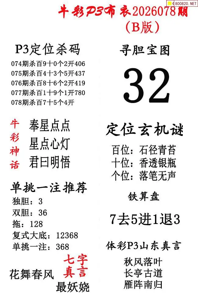 首页〉 P3图谜 走势图 P3预测P3图谜P3字谜P3技巧P3条件P3胆码P3杀码P5预测天齐图库走势图工具试机号 牛彩体彩P3布衣2026年078期AB版图谜(精华版) 发布时间:2026-03-28 21:50 工具:P3过滤缩水P3试机号走势图 推荐:宝彩APP 免费方案 智能荐号 热点导航 公告: 天齐新版APP<中大多>上线,点击领鲜 最新文章 26078期彩吧p3全图p3九宫图谜牛彩体彩P3布衣2026年078期AB版图谜(精华版)2026078期乾坤一句p3定三码图谜26077期彩吧p3全图p3九宫图谜领奖图26年078期P3图谜铁人三项26年078期P3图谜 更多P3图谜 > 福彩3D 双色球 大乐透 排列三 更多> 3D胆码 3D预测 3D字谜 3D图谜 解太湖 3D条件 3D杀码 P3预测 P3图谜 P3字谜 P3条件 P3胆码 P3杀码 热点导航 天齐图库 走势图 工具图表 试机号 宝彩专家 智能荐号 菜单导航 关闭 福彩3D 3D专家 3D胆码 3D预测 3D字谜 3D图谜 解太湖 3D条件 3D杀码 3D技巧 3D走势图 体彩P3/P5 P3专家 P3预测 P3图谜 P3字谜 P3条件 P3胆码 P3杀码 P5预测 P3走势图 双色球 双色球专家 双色球预测 双色球杀号 双色球字图 双色球胆码 双色球走势 双色球技巧 大乐透 大乐透专家 大乐透预测 大乐透杀号 大乐透胆码 大乐透技巧 大乐透走势 天齐图库 七星彩 七星彩专家 七星彩预测 七星彩图谜 七星彩杀号 七星彩技巧 七星彩走势 天齐走势 七乐彩 七乐彩专家 七乐彩预测 七乐彩杀号 七乐彩技巧 七乐彩走势 热点导航 彩宝网 宝彩网 宝彩网 开奖公告 宝彩专家 牛票票
