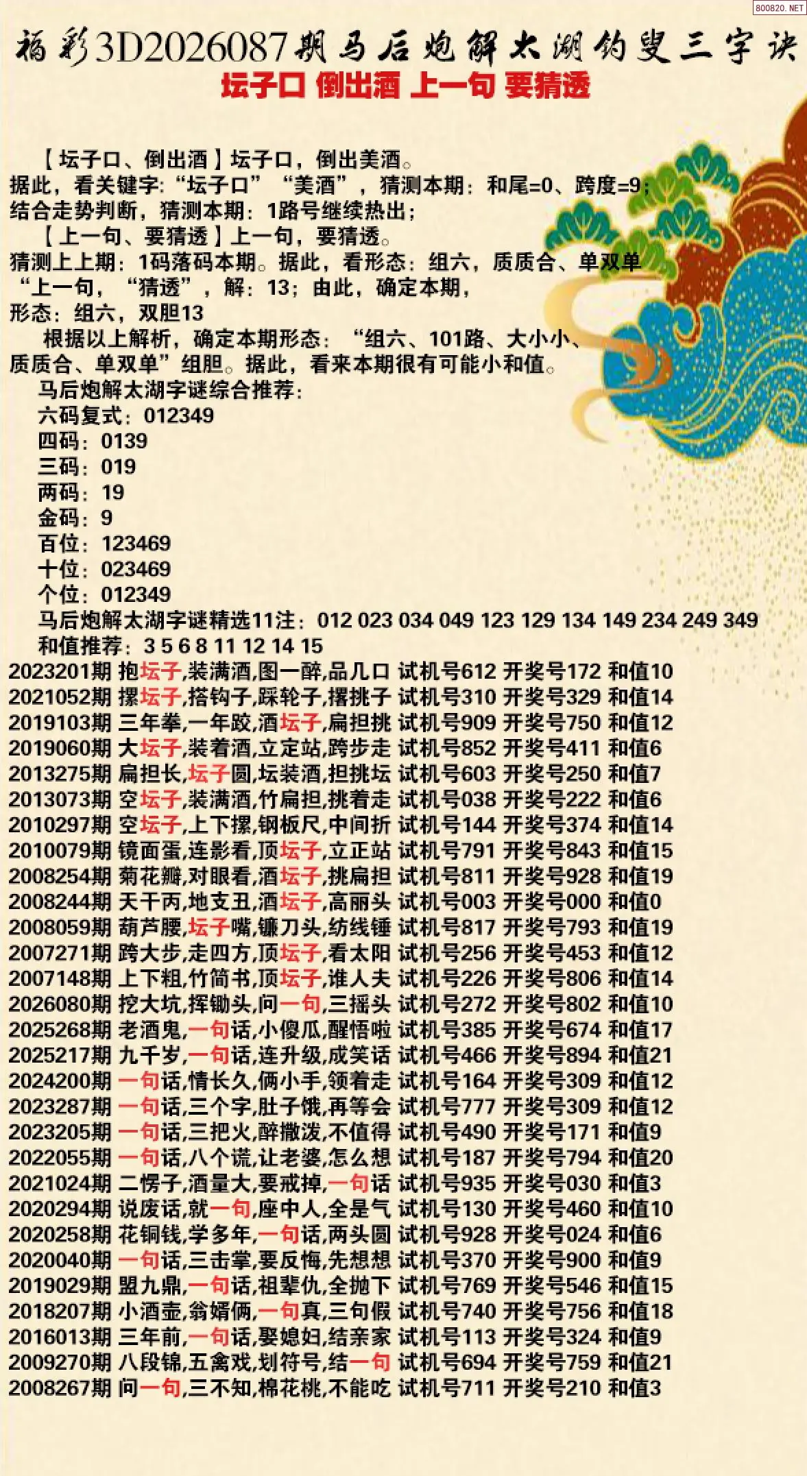 首页〉 解太湖 走势图 3D胆码3D预测3D图谜3D字谜解太湖3D技巧3D条件3D杀码天齐图库走势图工具试机号 26年087期马后炮解太湖字谜之-坛子口 倒出酒 上一句 要猜透 专题:马后炮解太湖谜 发布时间:2026-04-06 20:38 开奖:3D开奖结果3D近10期试机号 推荐:宝彩APP 免费方案 智能荐号 热点导航 公告: 天齐新版APP<中大多>上线,点击领鲜 最新文章 26087期3D丹东解太湖 天龙一语 布衣神算26年087期白鱼舟太湖钓叟三字诀解谜天涯草解太湖26年087期太湖 上一句福彩3D2026年086期[白虎]解太湖谚语 下有脚福彩3D2026年086期[青龙]解太湖字谜之上有头福彩3D2026年086期[鱼跃龙门]今期太湖钓叟解释 鸭子步 更多解太湖 > 福彩3D 双色球 大乐透 排列三 更多> 3D胆码 3D预测 3D字谜 3D图谜 解太湖 3D条件 3D杀码 P3预测 P3图谜 P3字谜 P3条件 P3胆码 P3杀码 热点导航 天齐图库 走势图 工具图表 试机号 宝彩专家 智能荐号 菜单导航 关闭 福彩3D 3D专家 3D胆码 3D预测 3D字谜 3D图谜 解太湖 3D条件 3D杀码 3D技巧 3D走势图 体彩P3/P5 P3专家 P3预测 P3图谜 P3字谜 P3条件 P3胆码 P3杀码 P5预测 P3走势图 双色球 双色球专家 双色球预测 双色球杀号 双色球字图 双色球胆码 双色球走势 双色球技巧 大乐透 大乐透专家 大乐透预测 大乐透杀号 大乐透胆码 大乐透技巧 大乐透走势 天齐图库 七星彩 七星彩专家 七星彩预测 七星彩图谜 七星彩杀号 七星彩技巧 七星彩走势 天齐走势 七乐彩 七乐彩专家 七乐彩预测 七乐彩杀号 七乐彩技巧 七乐彩走势 热点导航 彩宝网 宝彩网 宝彩网 开奖公告 宝彩专家 牛票票