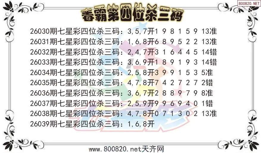 首页〉 七星彩图谜 走势图 七星彩预测七星彩图谜七星彩杀号七星彩技巧天齐图库走势图工具试机号 毒霸26年039期七星彩杀号图谜 发布时间:2026-04-08 11:41 走势图:七星彩基本走势图七星彩期尾走势图 推荐:宝彩APP 免费方案 智能荐号 热点导航 公告: 天齐新版APP<中大多>上线,点击领鲜 最新文章 中大多 七星彩第2026039今日一注100%中奖 七星彩第2026039徐文轩分析独胆定蓝 2026年039期龟丞相七星彩三码预测图豆豆先生2026039期七星彩三胆推荐图2026年老酒鬼039期七星彩胆码推测图百万雄师26年039期七星彩杀号图谜七星彩2026039期燕赤霞不定位杀码图毒霸26年039期七星彩杀号图谜 更多七星彩图谜 > 福彩3D 双色球 大乐透 排列三 更多> 3D胆码 3D预测 3D字谜 3D图谜 解太湖 3D条件 3D杀码 P3预测 P3图谜 P3字谜 P3条件 P3胆码 P3杀码 热点导航 天齐图库 走势图 工具图表 试机号 宝彩专家 智能荐号 菜单导航 关闭 福彩3D 3D专家 3D胆码 3D预测 3D字谜 3D图谜 解太湖 3D条件 3D杀码 3D技巧 3D走势图 体彩P3/P5 P3专家 P3预测 P3图谜 P3字谜 P3条件 P3胆码 P3杀码 P5预测 P3走势图 双色球 双色球专家 双色球预测 双色球杀号 双色球字图 双色球胆码 双色球走势 双色球技巧 大乐透 大乐透专家 大乐透预测 大乐透杀号 大乐透胆码 大乐透技巧 大乐透走势 天齐图库 七星彩 七星彩专家 七星彩预测 七星彩图谜 七星彩杀号 七星彩技巧 七星彩走势 天齐走势 七乐彩 七乐彩专家 七乐彩预测 七乐彩杀号 七乐彩技巧 七乐彩走势 热点导航 彩宝网 宝彩网 宝彩网 开奖公告 宝彩专家 牛票票